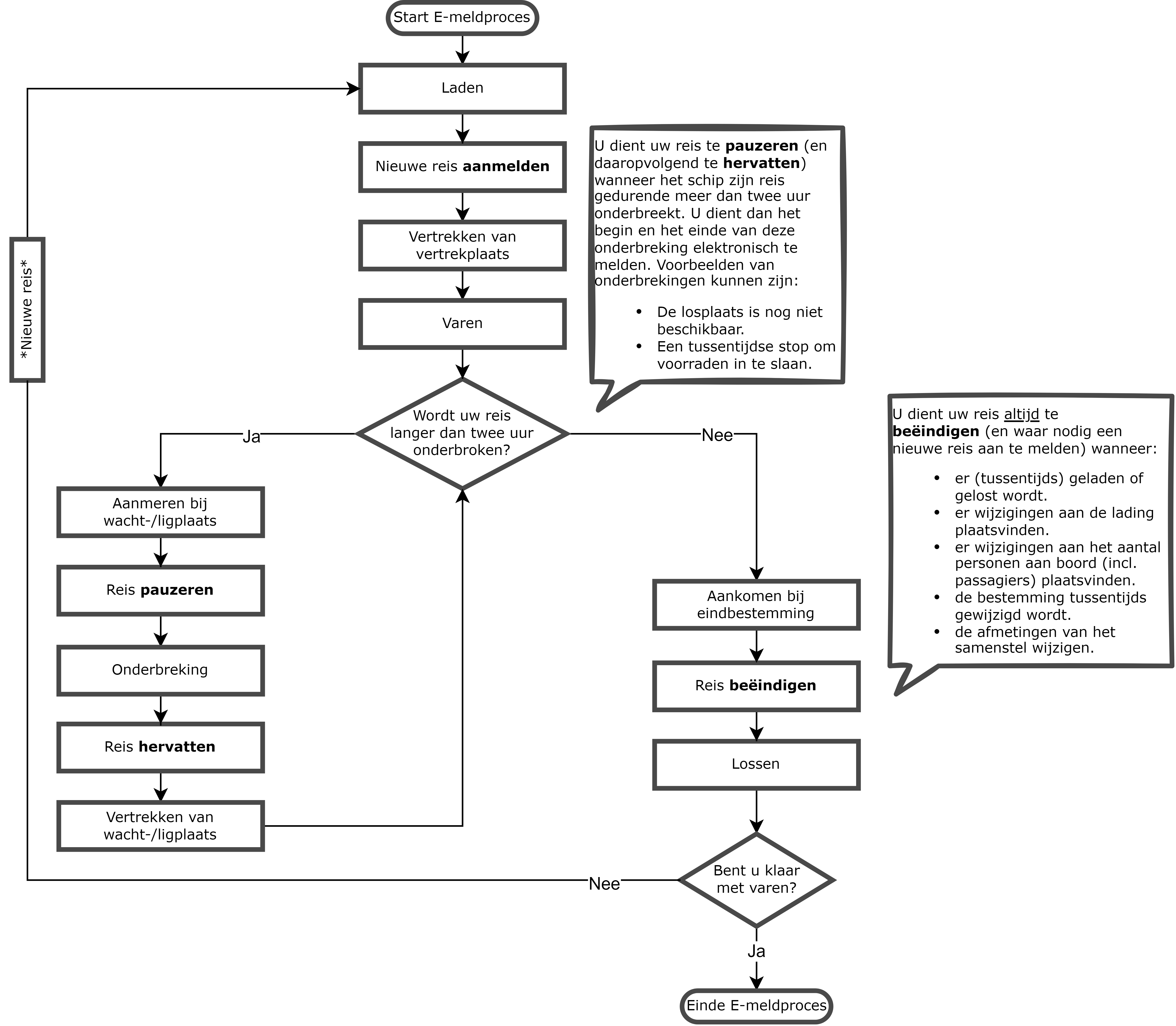 Een reis moet worden gepauzeerd wanneer het schip de aangemelde reis langer dan twee uur onderbreekt. In dat geval moet u zowel het begin als het einde van deze onderbreking elektronisch melden. Zodra de onderbreking voorbij is, moet u ook de hervatting van de reis doorgeven via BICS.